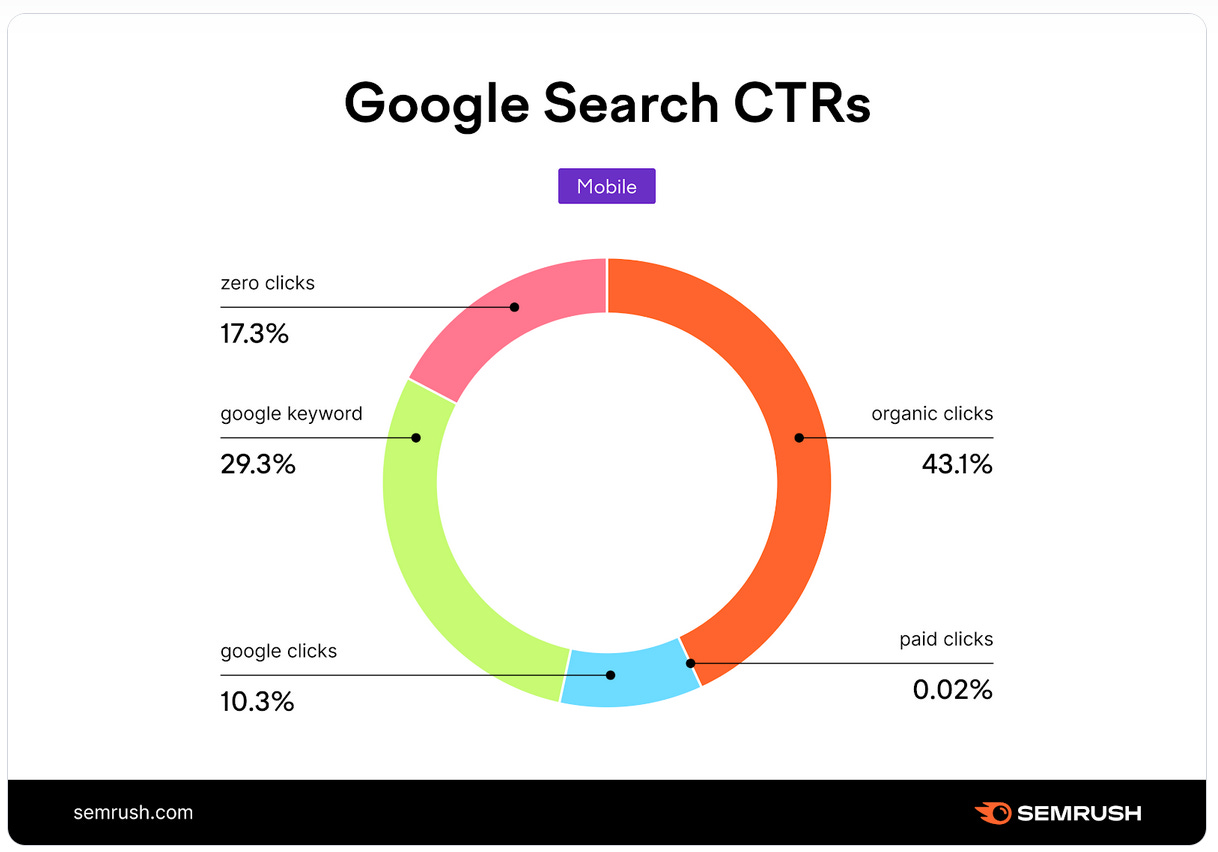 According to multiple studies (including the most recent one from Semrush), about half of searchers prefer to interact with organic results, that’s because the majority of searchers are willing to dig deeper, beyond quick answers (on both mobile and desktop devices):