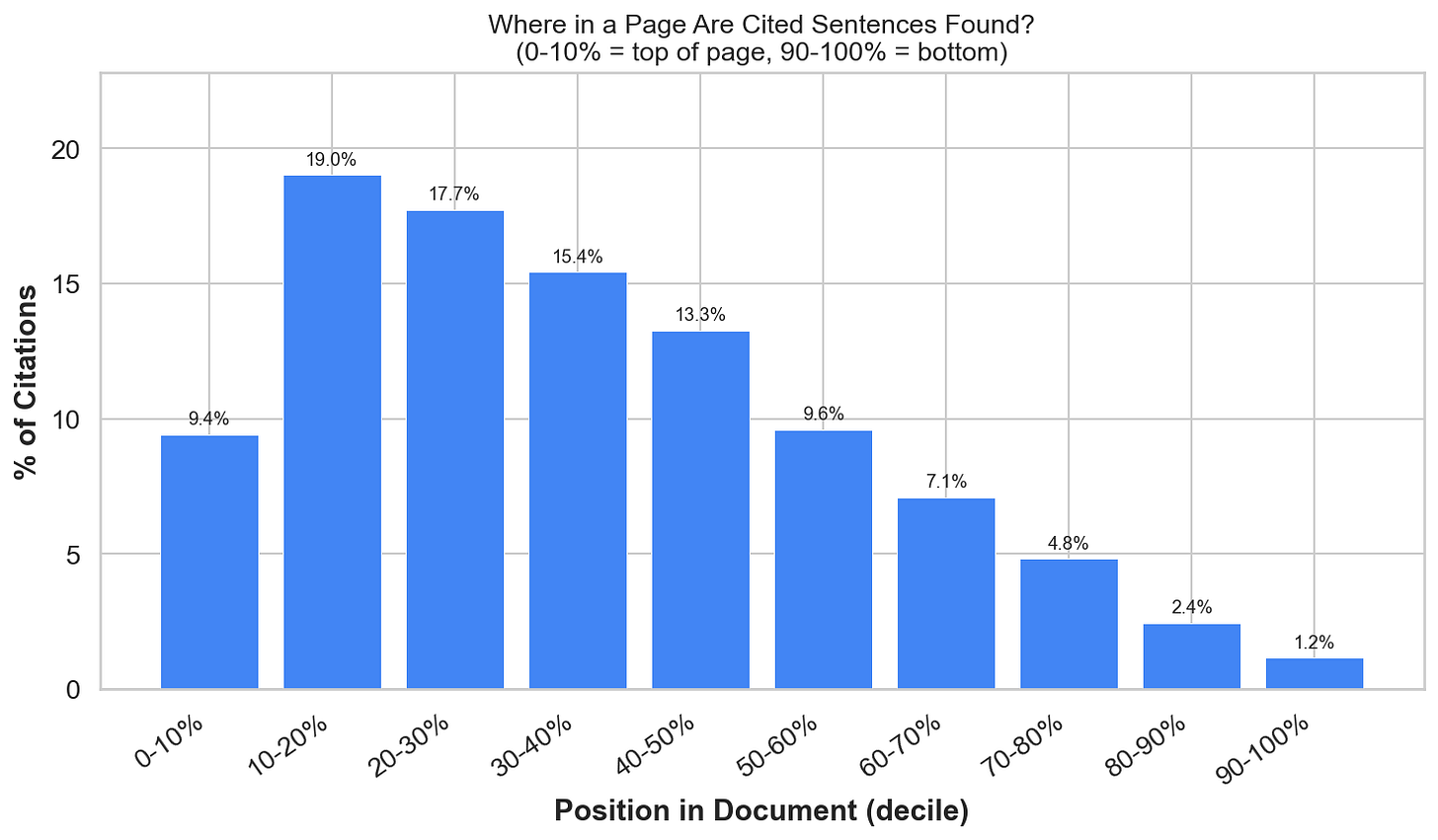 According to Kevin’s study, 44.2% of all citations came from the top third of the page. The probability of citation dropped significantly after this initial section: