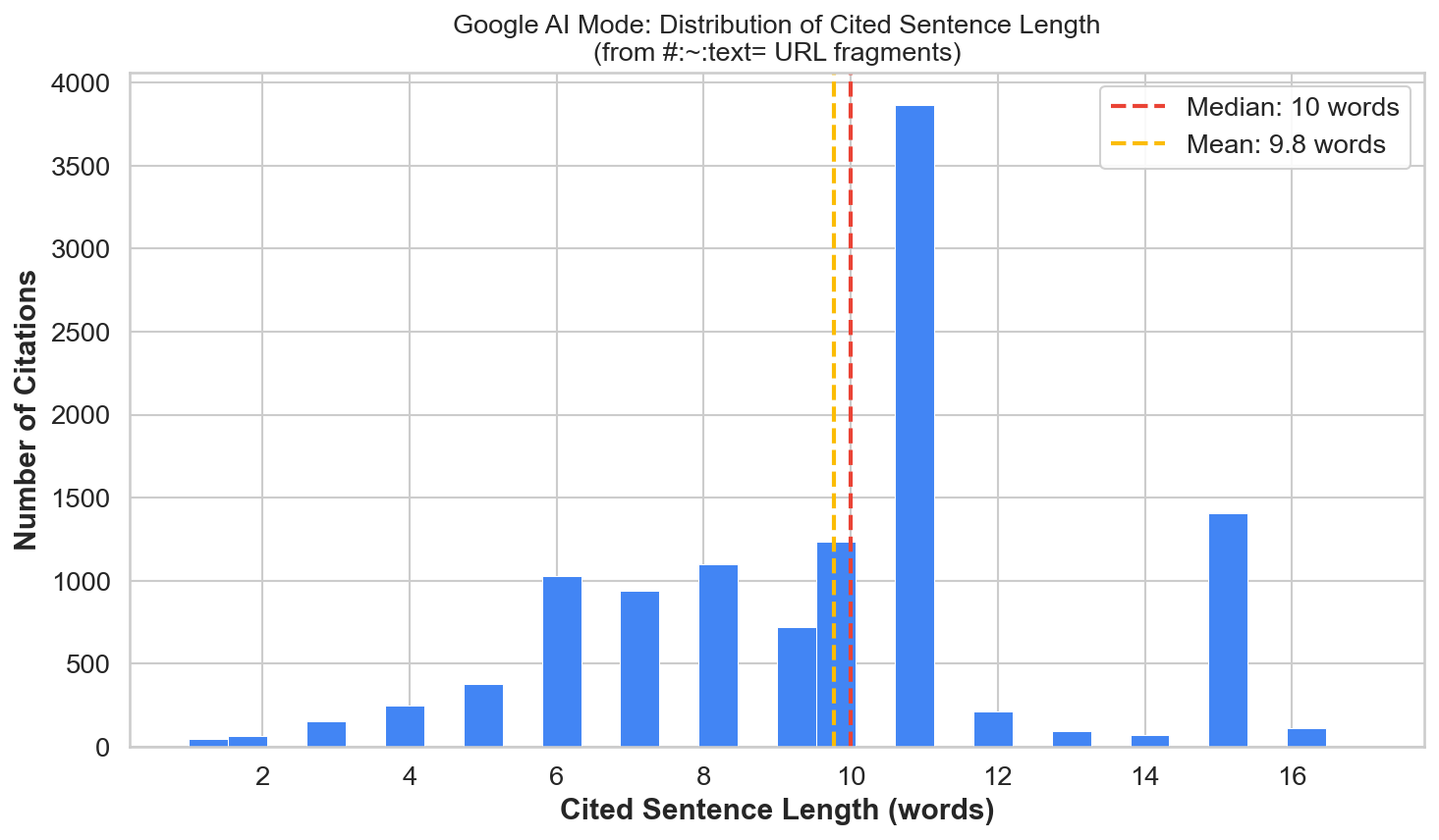 An analysis of 520 queries and 42,971 citations in AI Mode and Gemini by Daniel Shashko. This study analyzed cited URLs with embedded #:~:text= fragments. In Gemini and AI Mode, when clicked, these citations take you exactly to the sentence that was cited in the AI answer (and that sentence is highlighted). This way, the study analyzed sentences that were used by LLMs to create an answer and cite the sources.