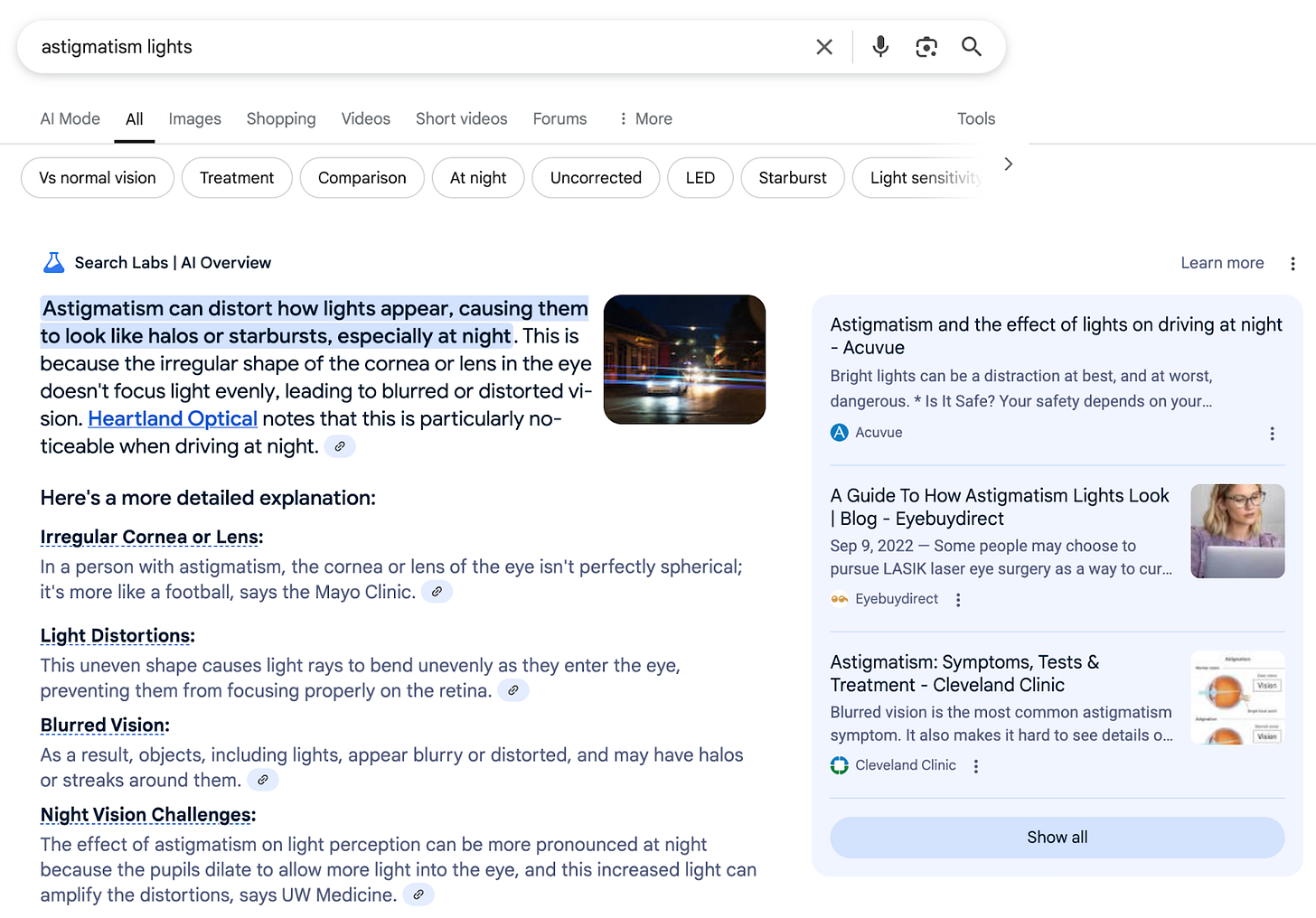 Here’s an example of an AI Overview that gives a very detailed and satisfying answer on how lights affect people with astigmatism:
