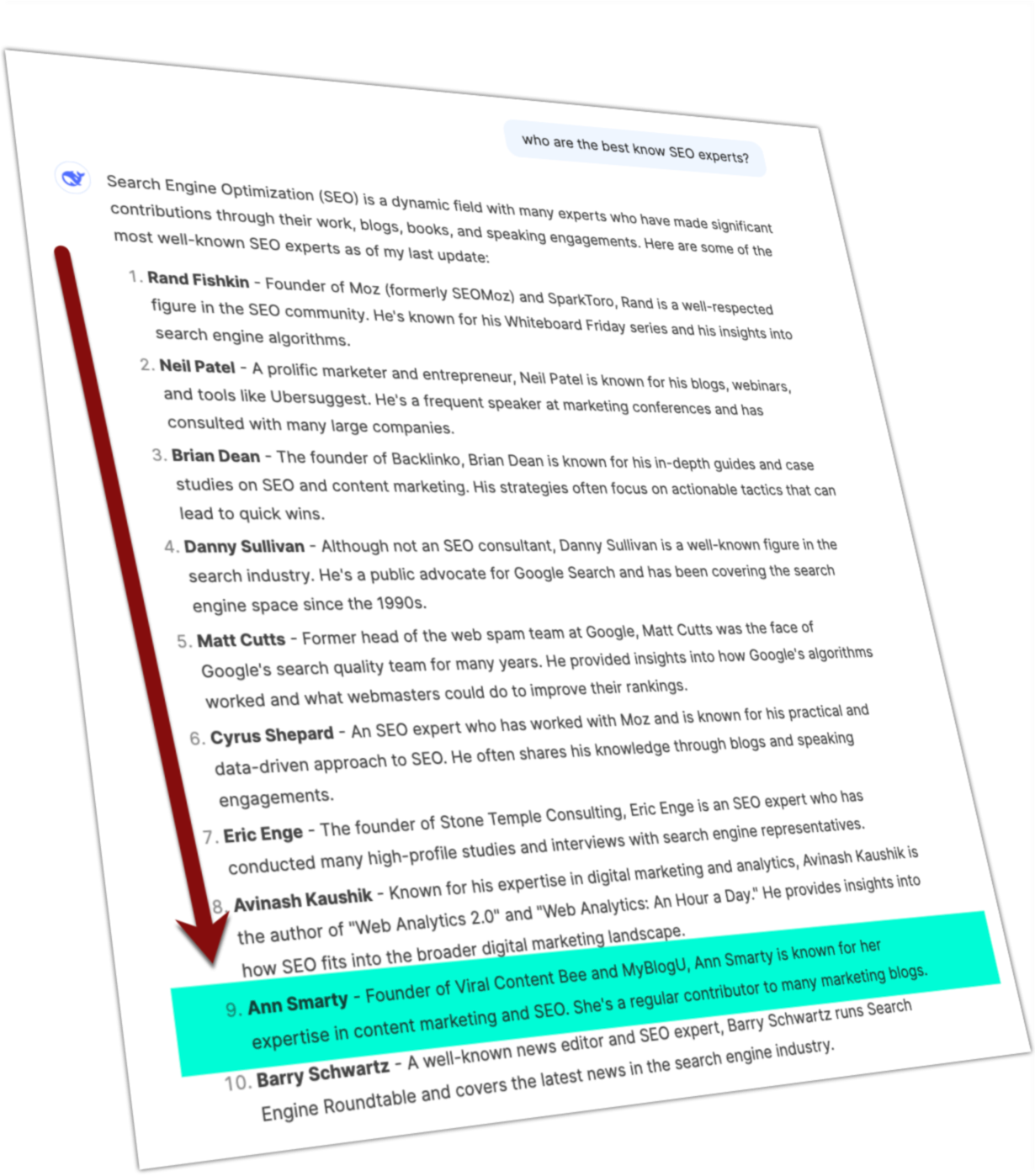 When you think of “NYC steakhouse,” you remember “Peter Luger…” When you think “SEO,” you think “Ann Smarty” 🙂 That’s not me saying. That’s DeepSeek, thank you: