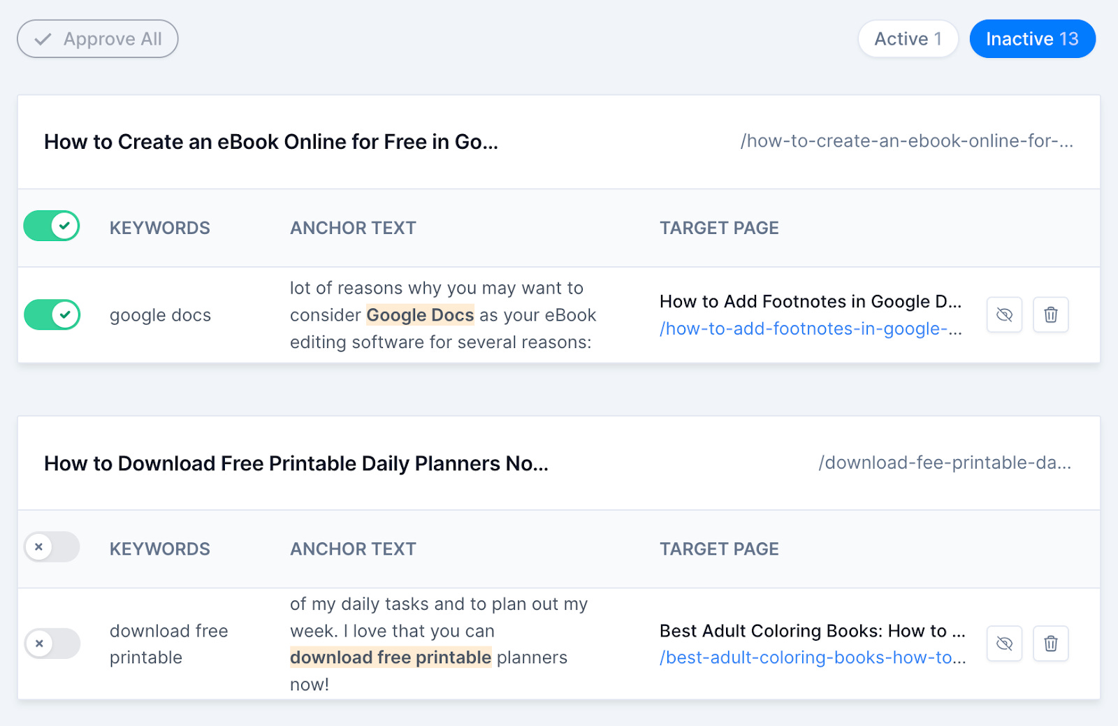 Link Storm crawls your site and suggests (1) immediate internal linking opportunities based on your current content and (2) more opportunities based on the additional copy you can add to each article. These potential opportunities are suggested based on the semantic similarity between two articles you can interlink.
