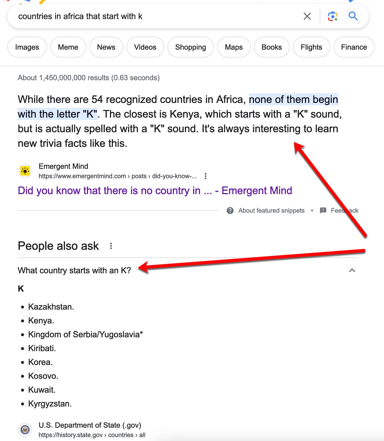 Guess what, someone copy-pasted this answer on their site and Google is now featuring it as an answer to a query “countries in africa that start with k”