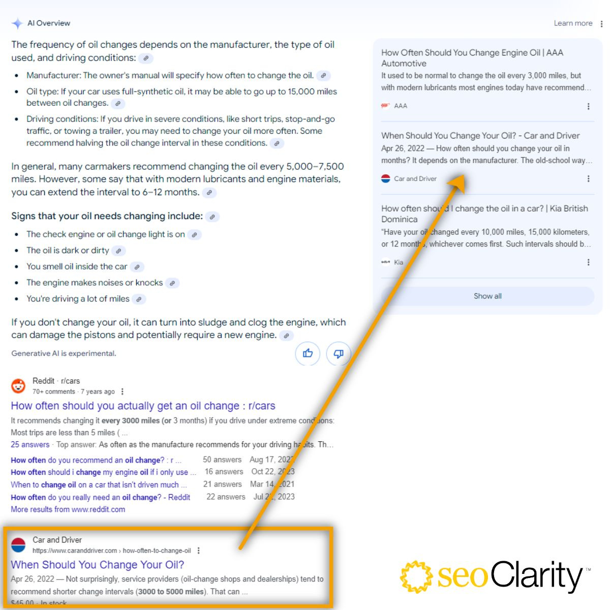Just like with featured snippets, ranking in the top 10 increases your chances of being linked from the AI Overview as a source.