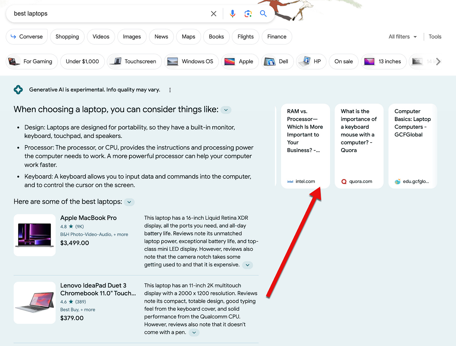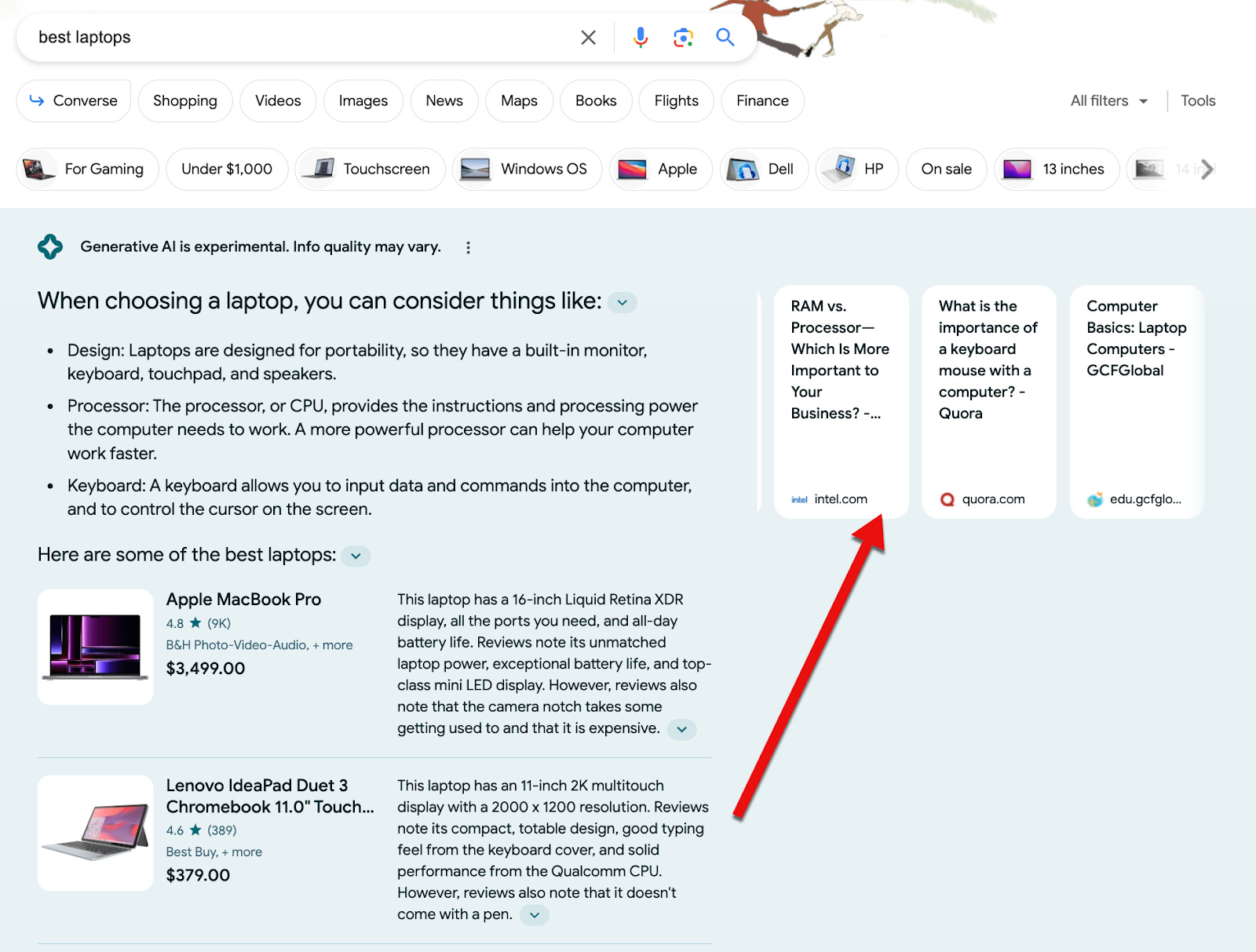 For example, if you search for “best laptops” the AI-generated references include results like “RAM vs. Processor—Which Is More Important to Your Business?”, “What is the importance of a keyboard mouse with a computer?” and “Computer Basics: Laptop Computers.” All of these results may help a searcher to make a better informed decision but they don’t directly respond to the initial query which asks to recommend best laptops:
