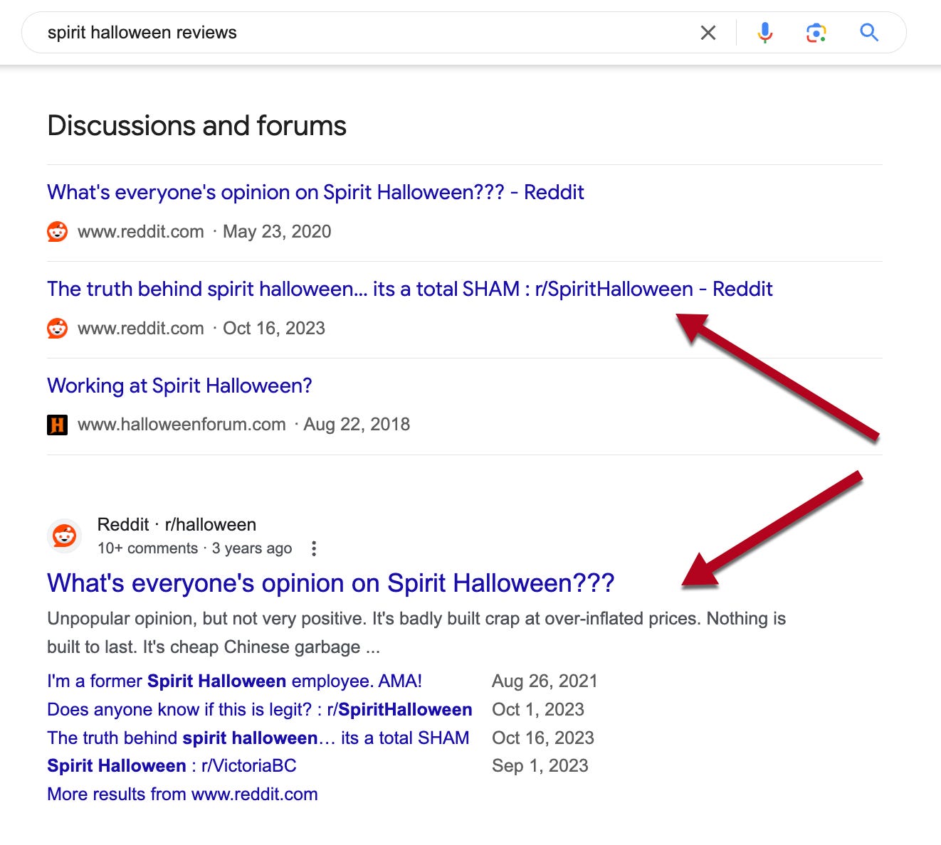 Reddit is being surfaced more and more in search. Google has a separate section called “Discussions and forums” which is mostly Reddit. Additionally, Reddit tends to rank well organically. Here’s an example of Reddit ranking for a branded query in a separate section and then immediately as an organic listing:
