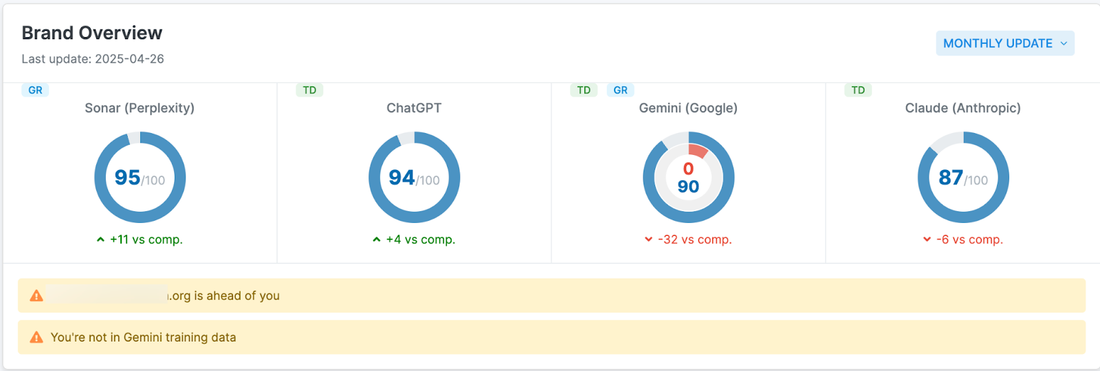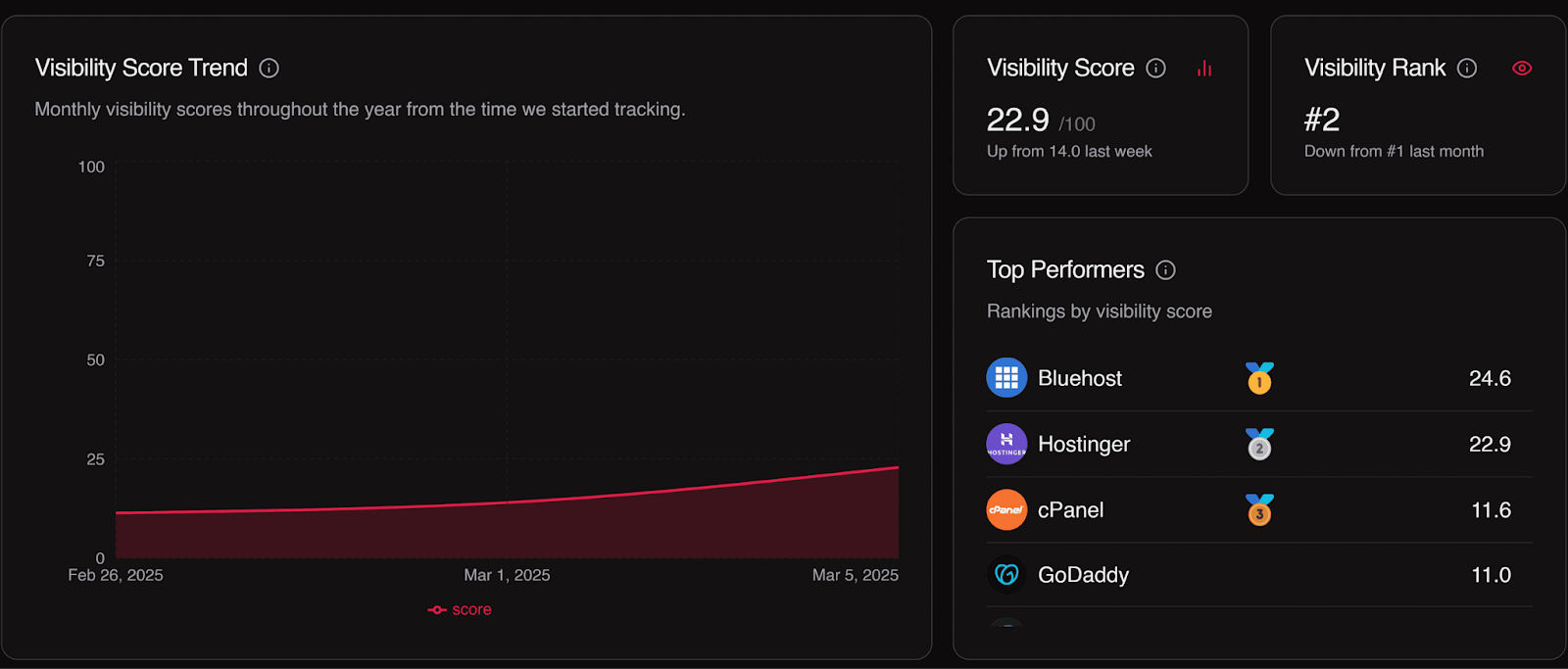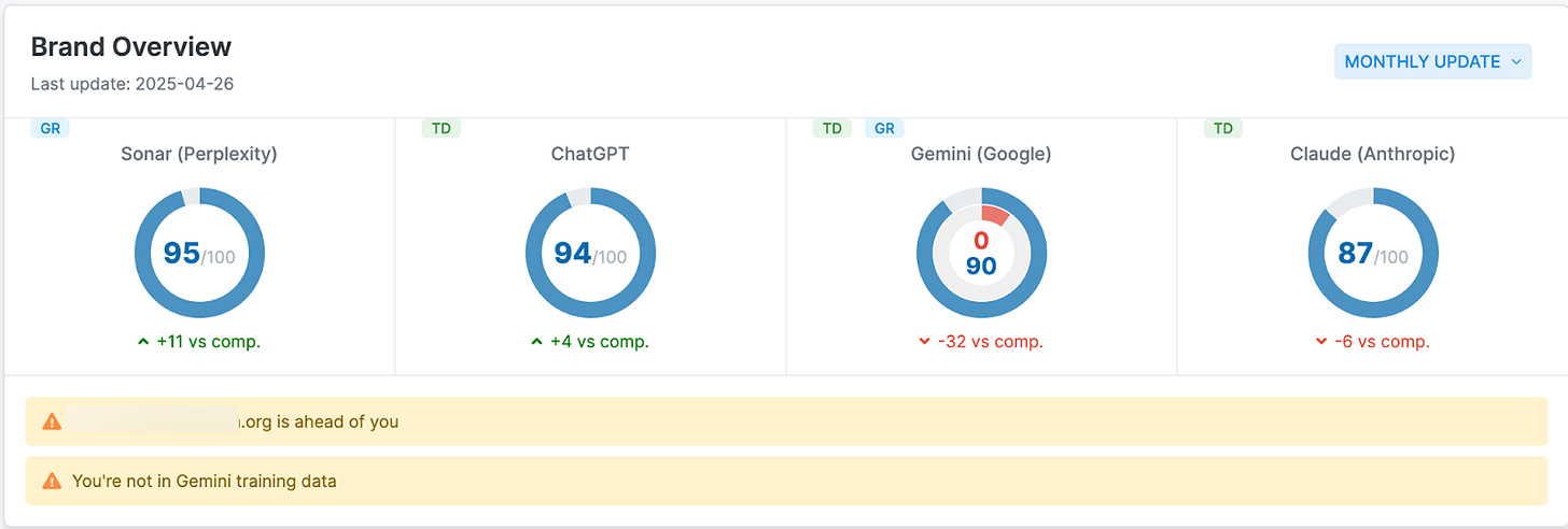 The great feature of the tool is that it shows you better-performing competitors, i.e. those that are included in answers for your relevant prompts.