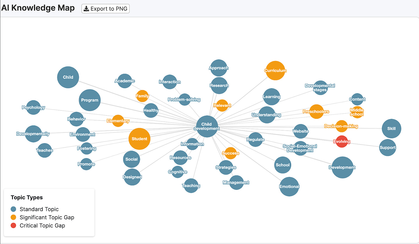 As you develop brand knowledge content, you can rerun your reports to see how the training data is changing for your brand to be better associated with missing concepts. You can create a more specific report on any knowledge gap for the tool to suggest more topics and specific topic ideas for you to create more content to be better associated with those topics.