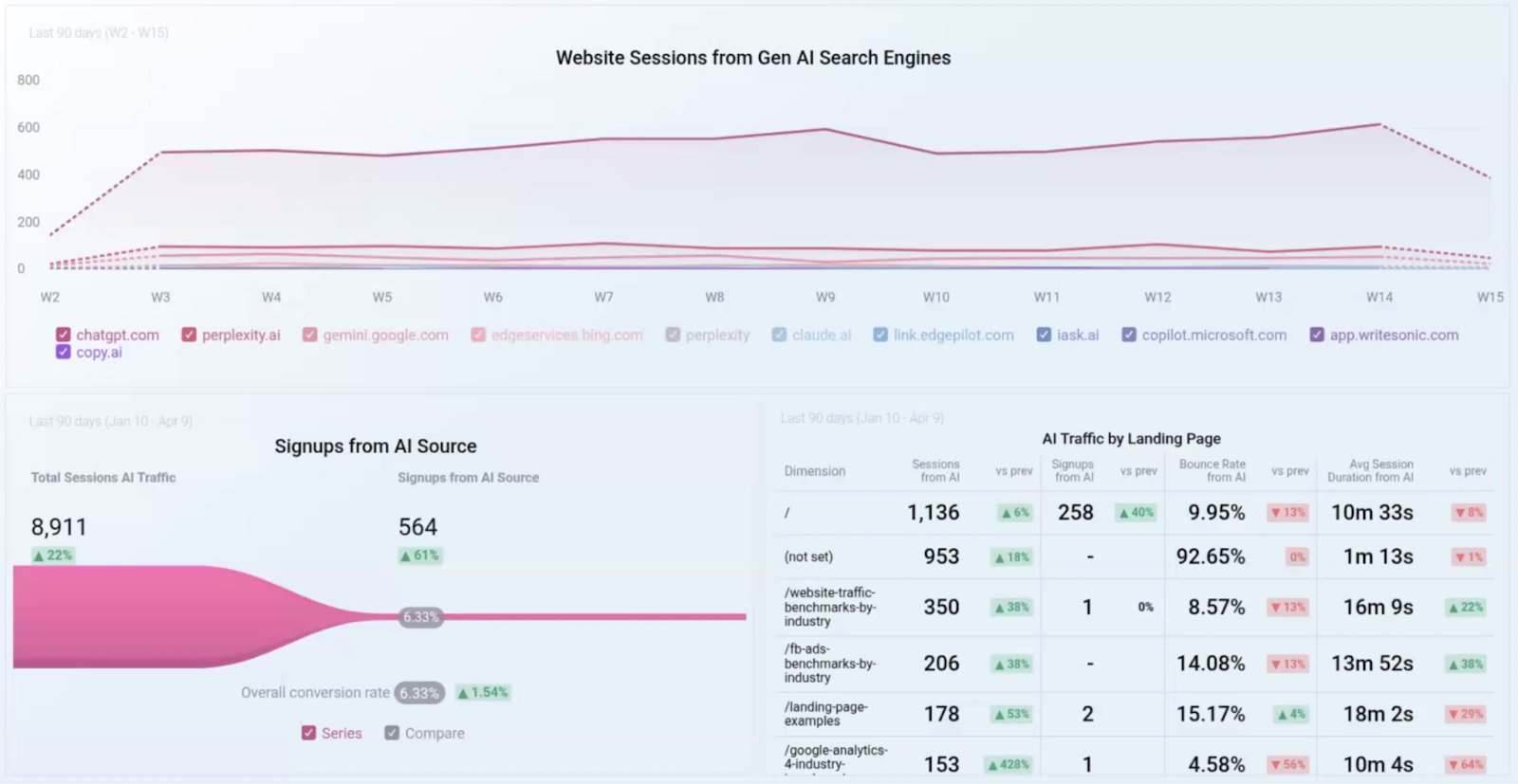 There are third-party solutions that you can use to filter GA4 data to track AI traffic. Databox lets you add this report to your dashboard, and it will also overlay it with other important data, like conversions: