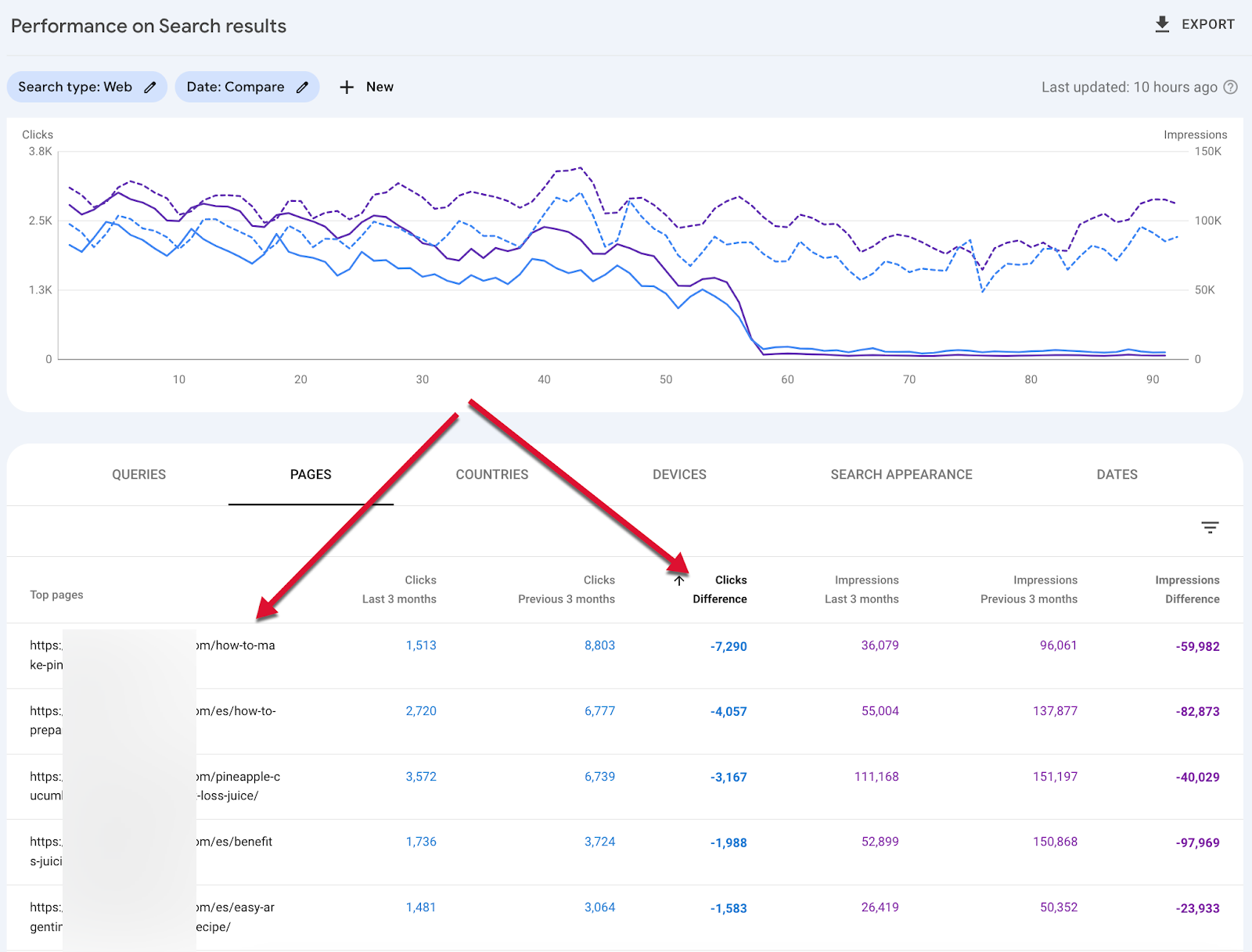 Click the “Clicks” column header twice to sort by pages that saw the biggest drop