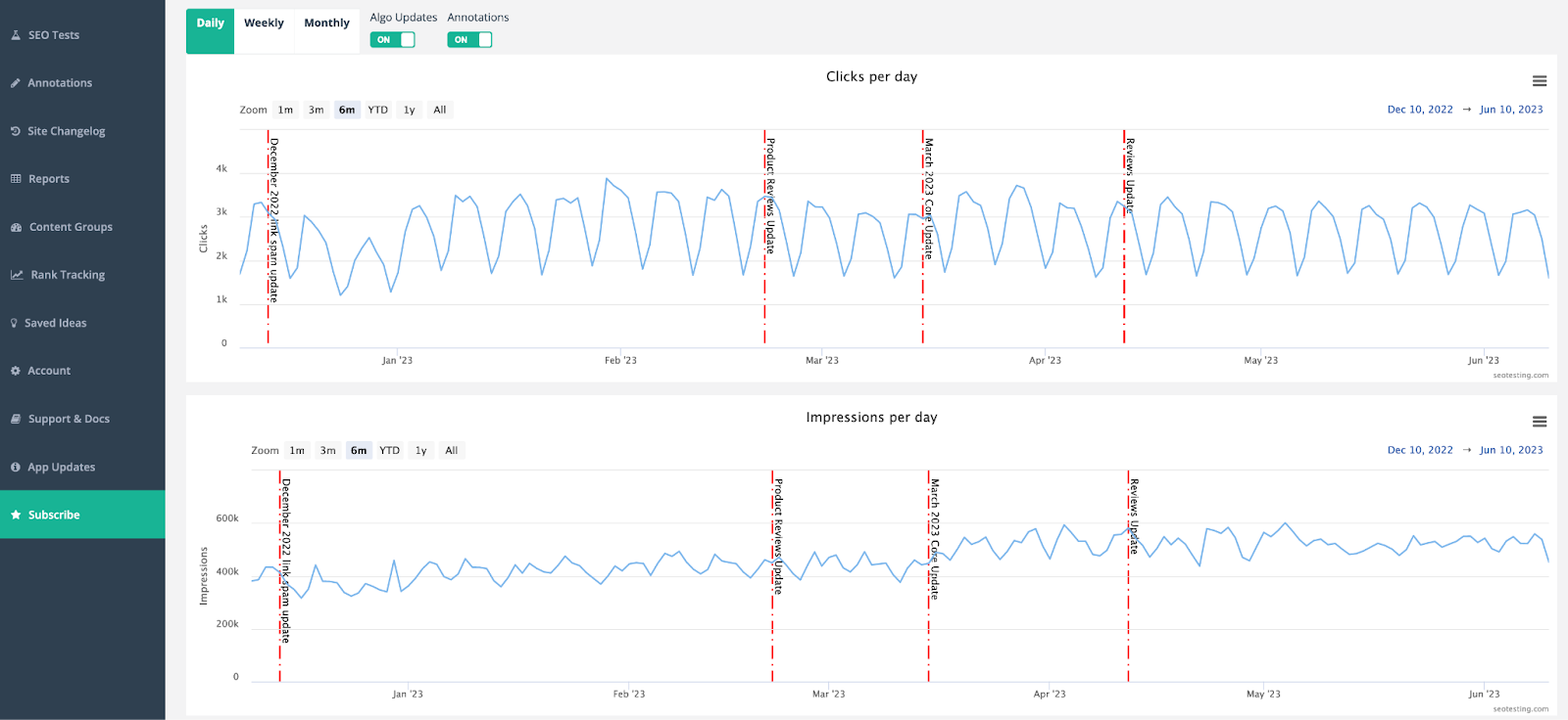 SEO Testing is a premium tool that imports your Search Console data and overlays it with the records of confirmed Google Updates.