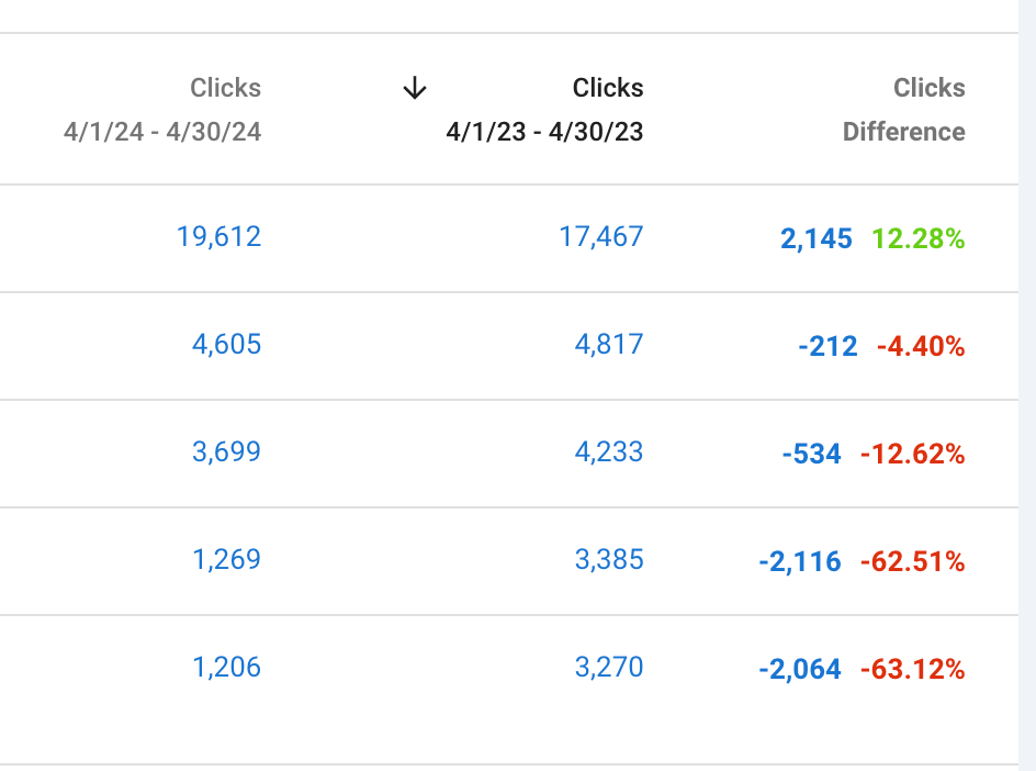 The tool gives you more flexible controls over which dates or periods you want to compare your traffic. It also adds percentages allowing you to easily spot any negative trends with color coding: