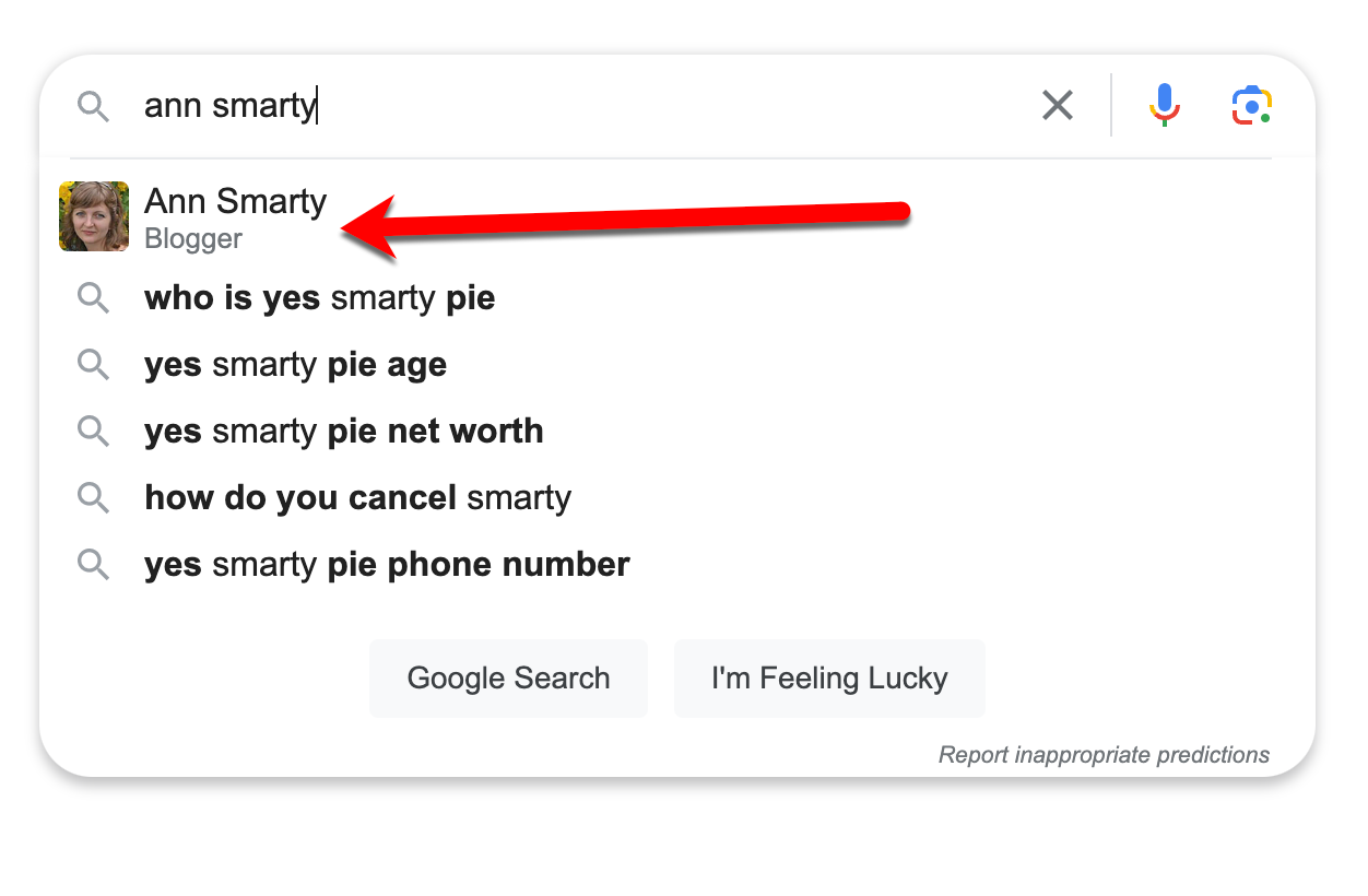 Google Autocomplete is another good tool to tell if Google considers a site, a person, or a product an entity (even if knowledge panels are not triggered for those searches). Google Autocomplete also makes it easy to identify how exactly Google classifies each entity as it lists a category, as in the example below: