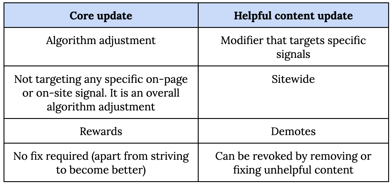 Core update vs Helpful update at a glance