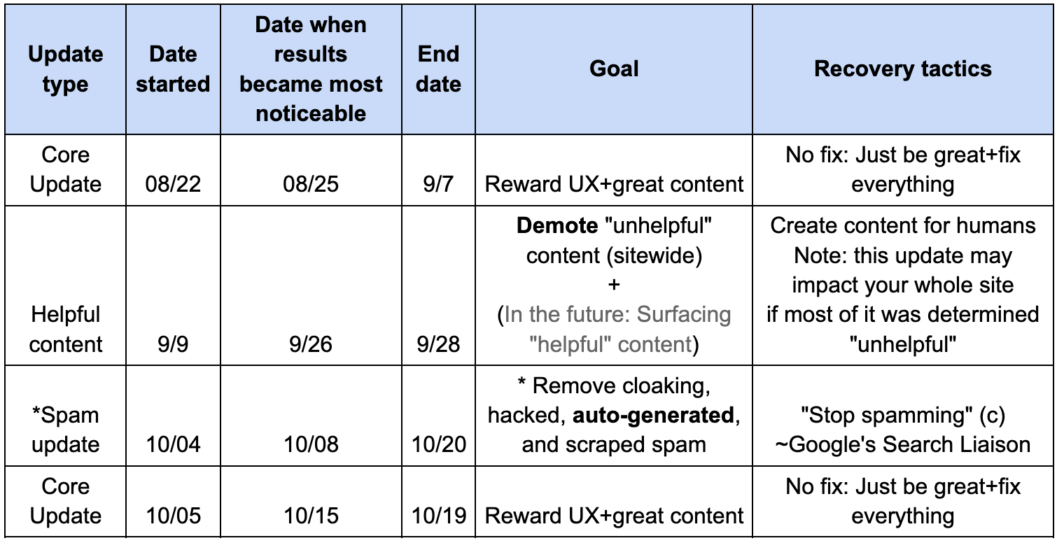 There have been FOUR Google updates since late August: Core Update, Helpful Content Update, Spam Update, and another Core Update. Here's how to understand what happened