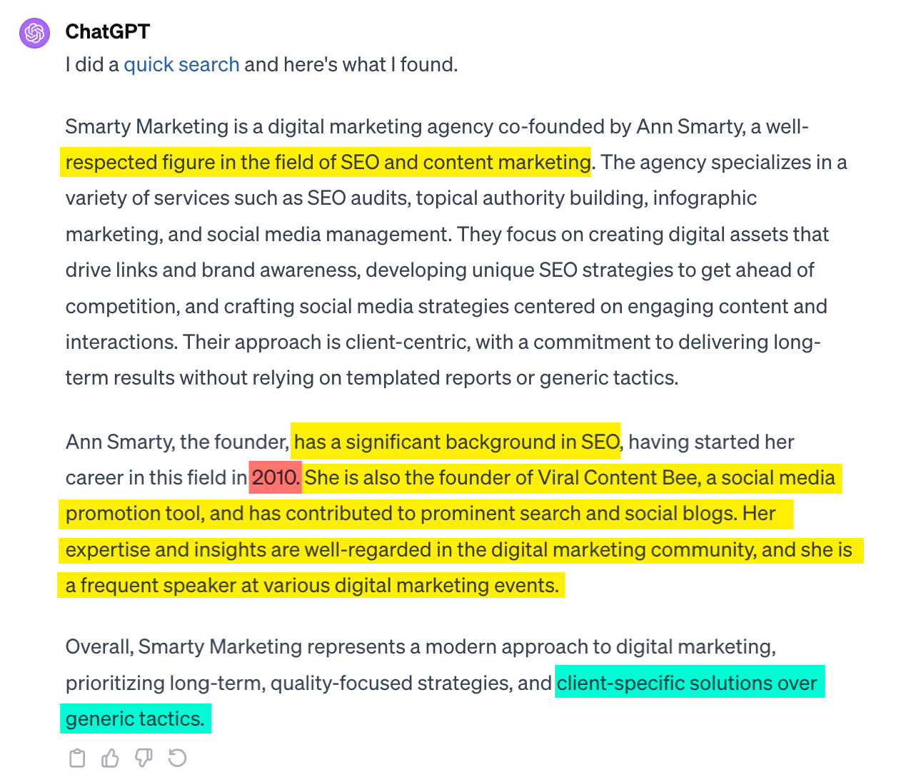 Here’s the screenshot if you need a proof. I highlighted in yellow the parts that ChatGPT added (not mentioned on our site). ChatGPT did get one thing wrong (I started my SEO career in 2005 but I don’t blame it. Even I have a hard time believing it was so long ago!).