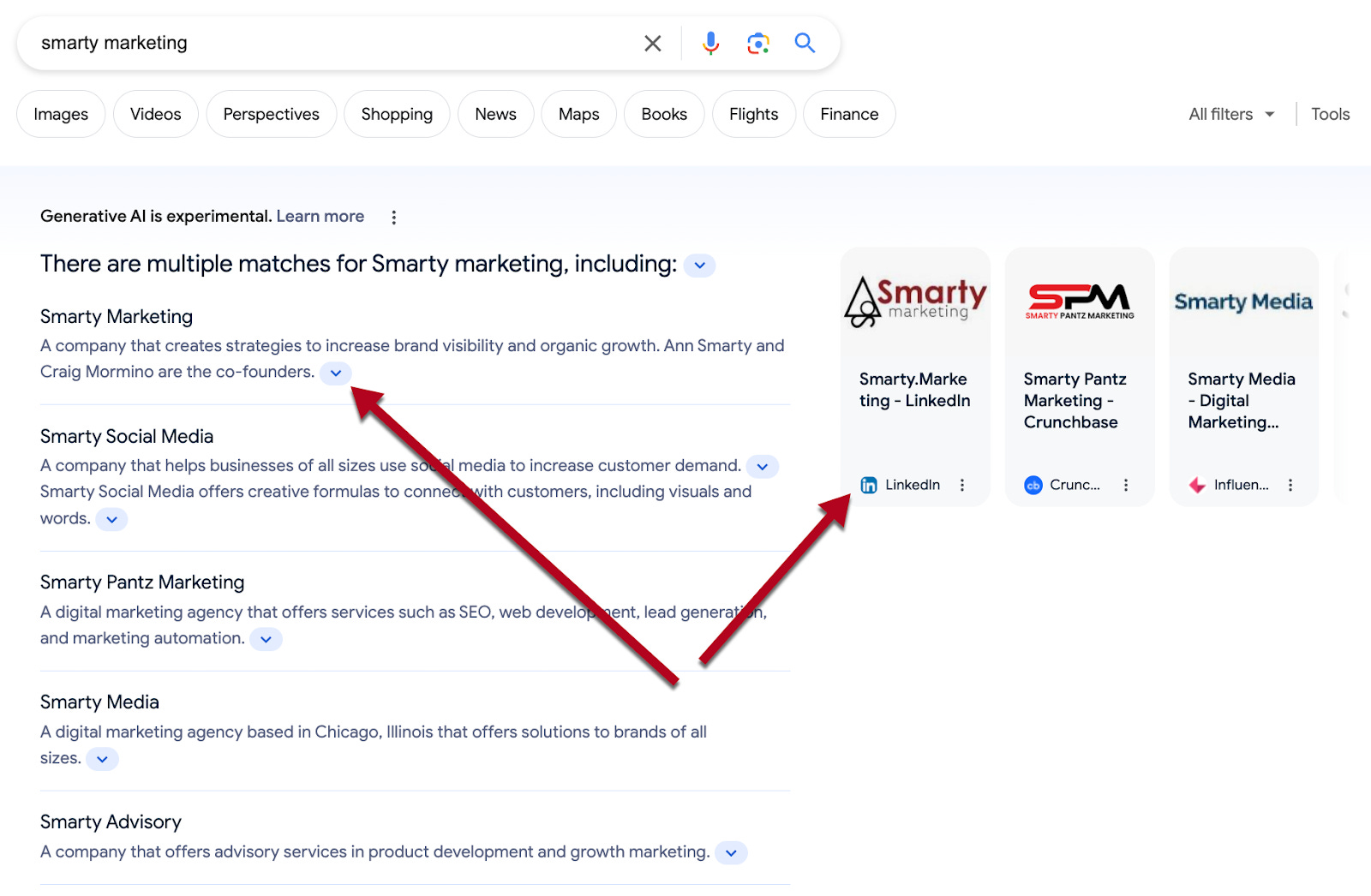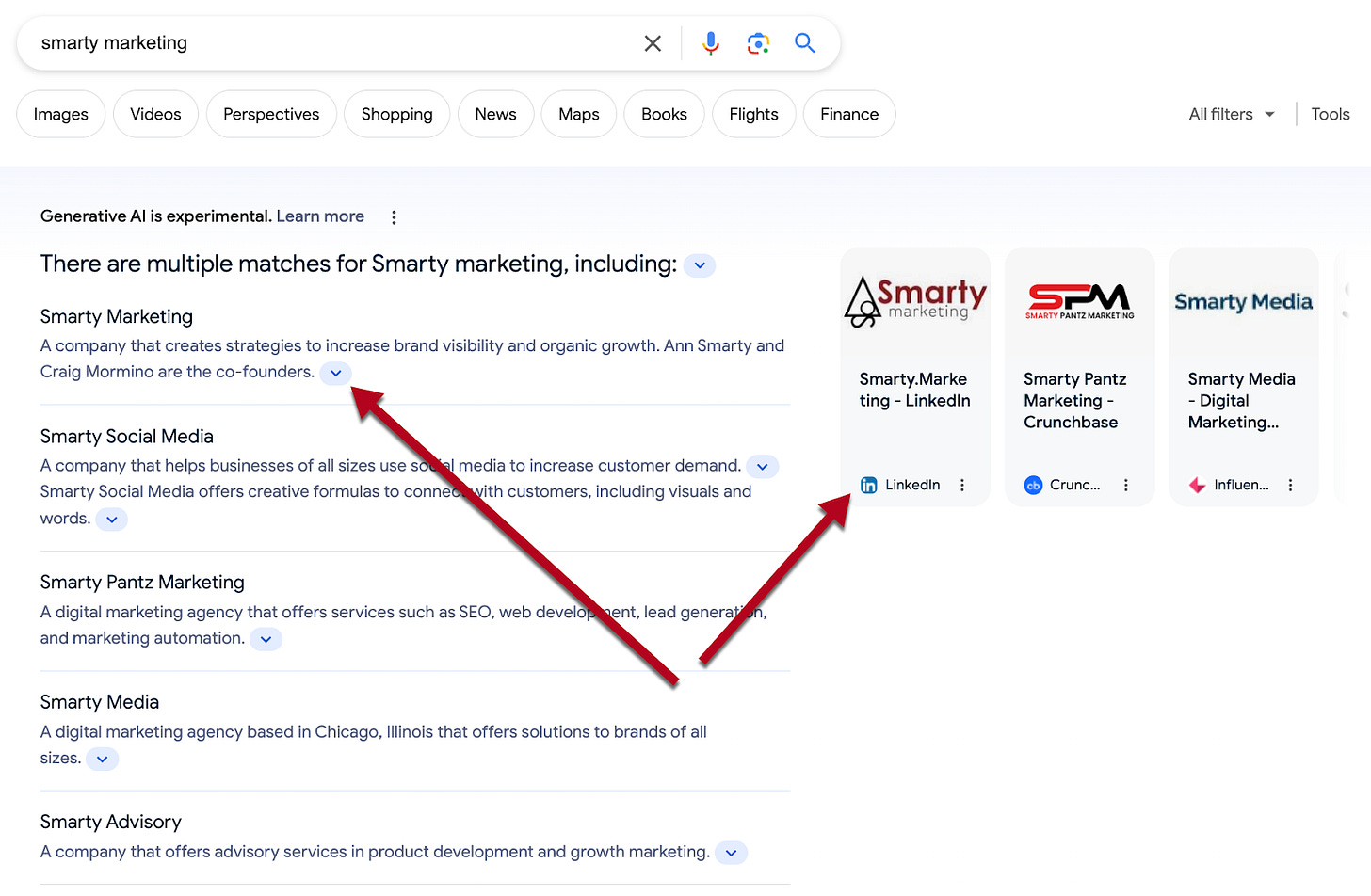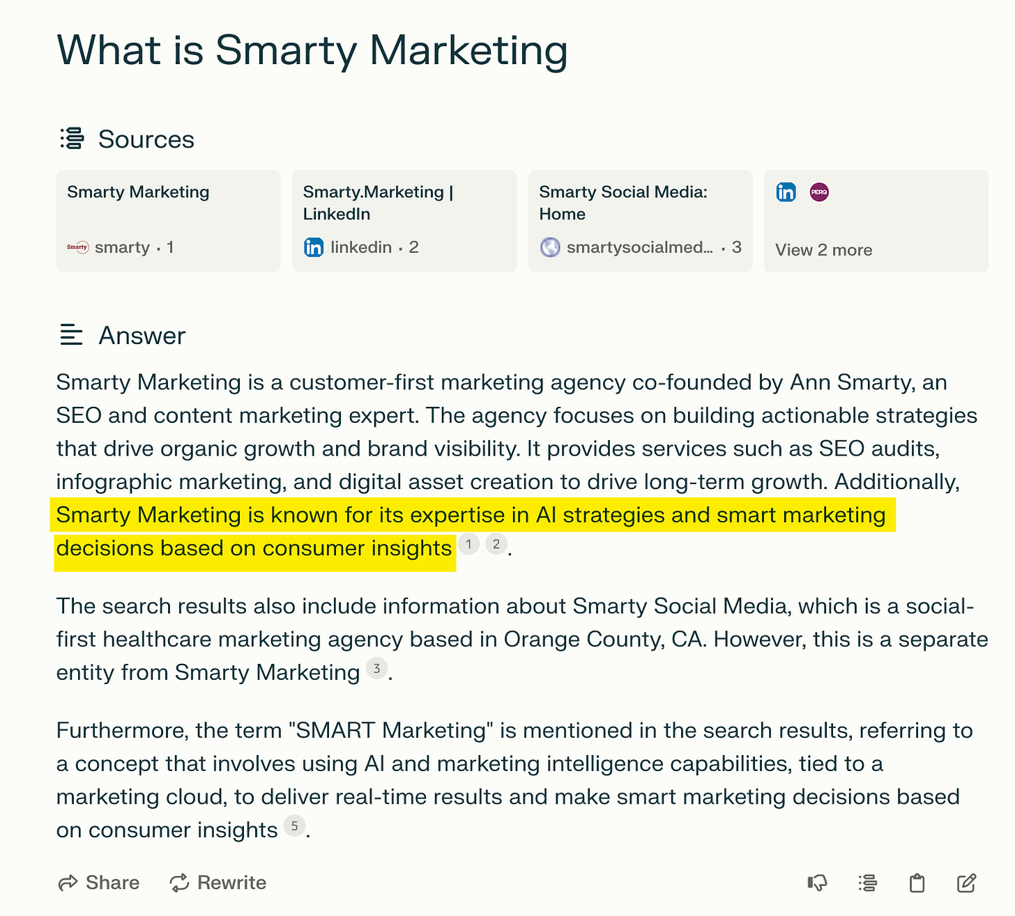 Perplexity.ai is being named Google’s biggest future threat because, evidently, it can search. Unlike the other two platforms, this one wasn’t sure my search was navigational, so it also included a quick blurb on “what SMART marketing is”, in case I misspelled smart.